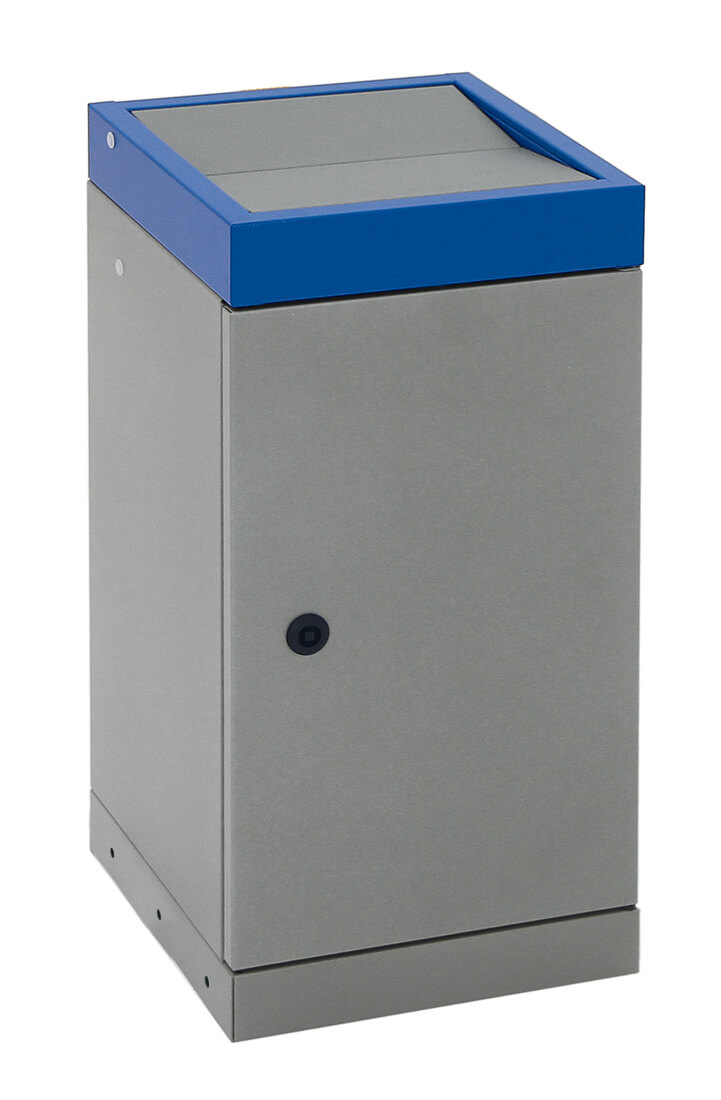 Einfachster Abfalleinwurf möglich: Aus vollständig verzinktem Qualitätsstahlblech gefertigt und strukturiert pulverbeschichtet. Die beiden Schwingdeckel öffnen nach unten, so dass der Abfall nahezu berührungslos eingeworfen werden kann. Feuer und geruchshemmend. Innenbehälter aus verzinktem Stahlblech, Fassungsvermögen 30 Liter. Der Innenbehälter wird durch eine frontseitig eingelassene und per Vierkantschloss verschließbare Flügeltüre entnommen (Vierkantschloss wird mitgeliefert). Zwecks höherer Sortiersicherheit ist das gesamte Kopfelement farbig beschichtet. Frontseitig sorgen 2 Stellfüße für den Ausgleich bei Bodenunebenheiten (Niveauregulierung). Der Behälter kann mit dem Rollensatz Art.-Nr. 5407000 auch nachträglich zur fahrbaren Variante umgerüstet werden. Dann beträgt die Gesamthöhe 700 mm. Der Artikel wird vollständig in Deutschland gefertigt und in einer TÜV-kontrollierten Produktionsstätte hergestellt. Der Hersteller gewährt eine Garantie von 5 Jahren. Außerdem ist der Behälter als nicht brennbar eingestuft (DIN 4102, Brandschutzklasse A1 bzw. DIN EN 13501-1). Farbgebung Korpus: graualu-struktur, Farbgebung Kopfelement: einzianblau RAL 5010.