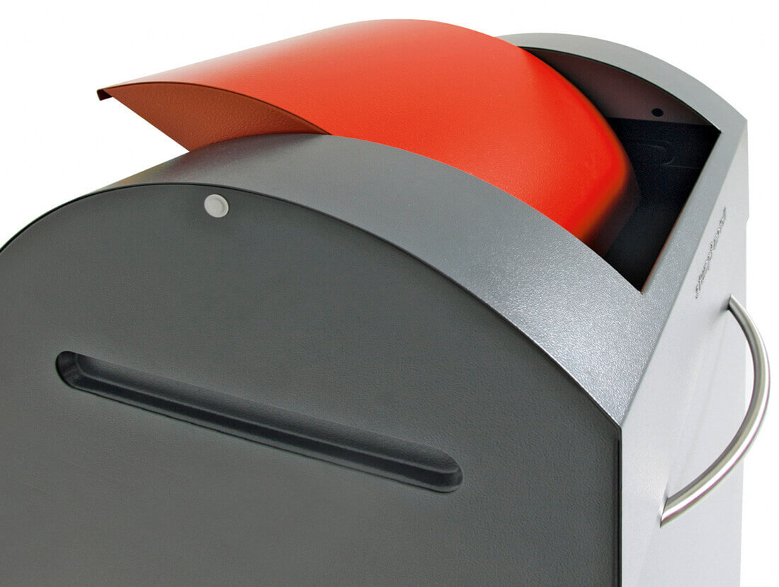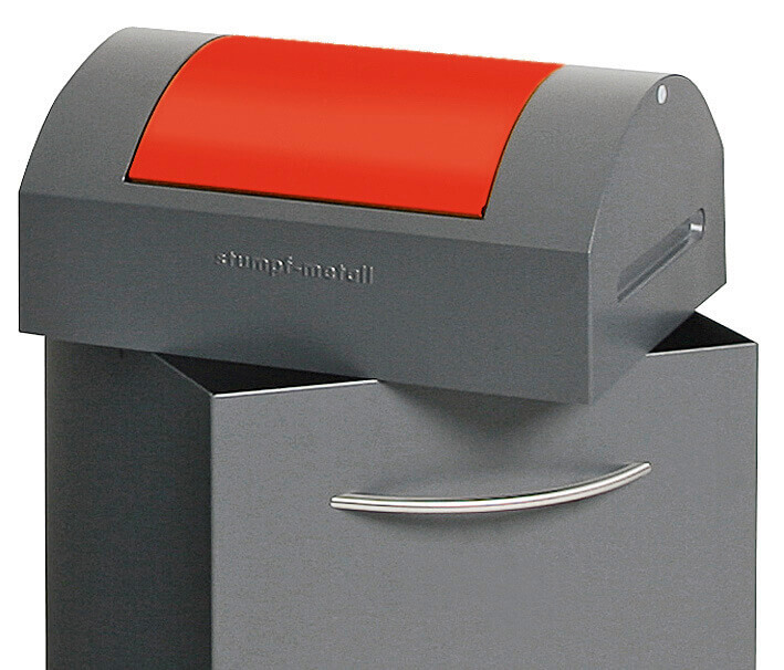 Praktischer und kompakter Abfallsammler mit selbstschließenden Pendeldeckeln. Der Abfallsammler wird aus verzinktem Qualitätsstahlblech gefertigt und zusätzlich hochwertig pulverbeschichtet. Das Kopfelement ist abnehmbar. Der Behälter kann durch frontseitig angebrachte Rollen sowohl stationär als auch mobil eingesetzt werden. Fassungsvermögen 60 Liter. Mit halbrunden, ergonomischen Griffen aus Edelstahl sind die Sammler leicht zu handeln. Der Sammler wird vollständig in Deutschland produziert und ist TÜV/GS geprüft. Die Herstellergarantie beträgt 5 Jahre. Außerdem ist der Behälter zertifiziert selbstlöschend und als nicht brennbar eingestuft (DIN 4102, Brandschutzklasse A1 bzw. DIN EN 13501-1). Farbgebung Korpus: anthrazitgrau RAL 7016, Farbgebung Pendeldeckel: feuerrot RAL 3000.